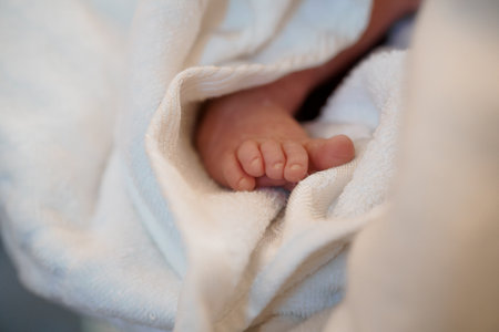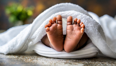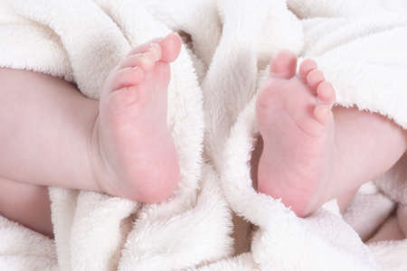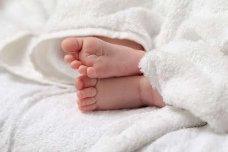 adorable baby feet covered in a white blanket maternity and babyhood concept