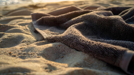Close up of a dark brown towel on sandy beach. Beautiful vacation background