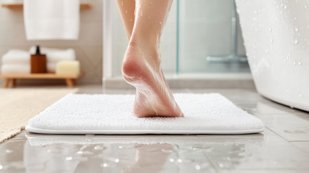 Wet feet step onto a plush, white bath mat in a bright, clean bathroom