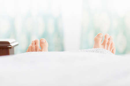 Close up on female feet of unknown caucasian women side view foot on the bed or sofa in the room at home in day with clean toes relaxing