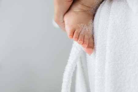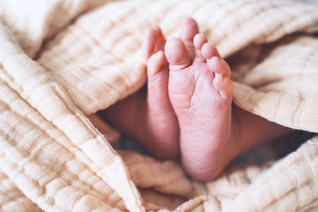 Close-up of cute newborn baby feet wrapped in blanket. Tiny legs of new born child.