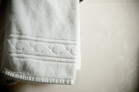 Close-up image of folded towels in low light, emphasizing texture and shadows.