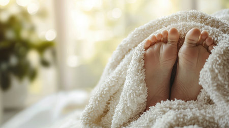 Soothing morning light on cozy feet wrapped in a soft blanket indoors
