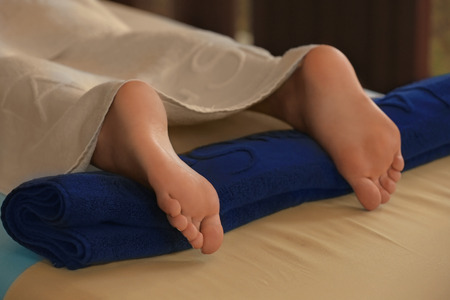 Foot care concept. Treatment and wellness. Beauty and relaxation. Female legs peeking out from blanket. Copy space.