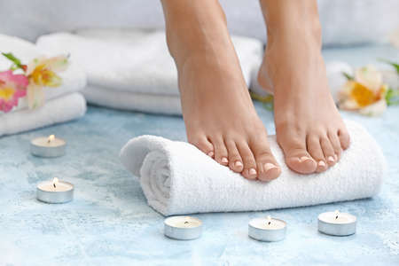 Advertising of cosmetics for feet. Slender female legs on twisted white towel. Cosmetology procedures for foot care. Beauty spa concept. Place for text.