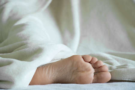 Feet of little sleeping child under white blanket on the bed. Close up.