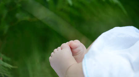 Closeup of newborn baby girl feet on white blanket outdoor. maternity and childhood concept.