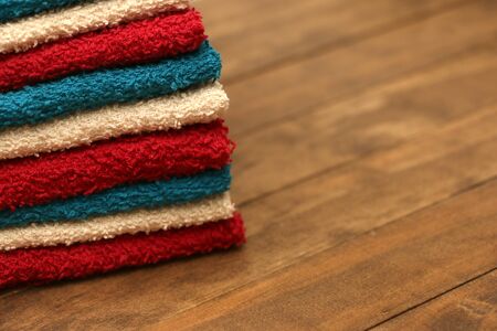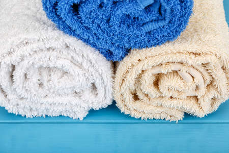 blue and aqua green clean towels soft hygiene at home in bathroom background.
