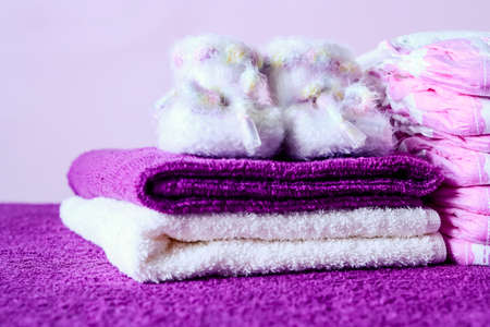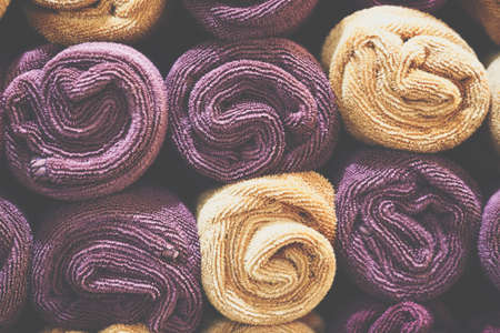 Colorful purple violet beige rolled up towels for Barbershop, Spa Bath Swimming pool, sea Beach, gym fitness in resort hotel concept. Fabric texture cloth background