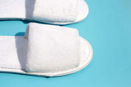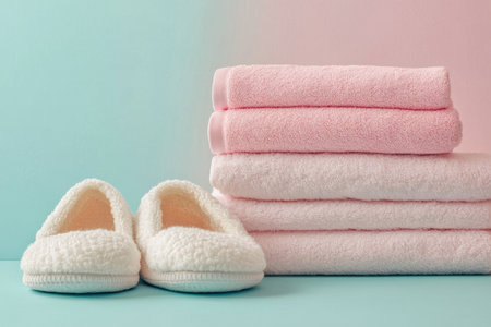 Cozy slippers next to a towel stack on a pastel background, emphasizing comfort and warmth