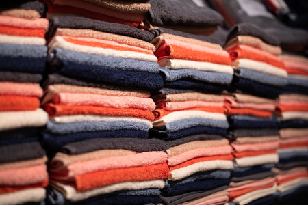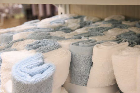 Sale of soft bath towels in the store. Stack of spa accessories.