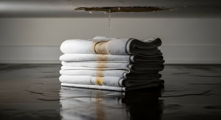 Water drips from a brown, stained hole in a ceiling, soaking a stack of white towels placed on a dark, wet floor below. The scene illustrates a serious plumbing leak, flooding, and the resulting water damage to a home.