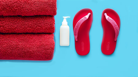 Red towels, flip flops and white dispenser bottle arranged on vibrant blue background in flat lay summer style.