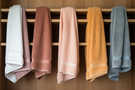 Colorful towels on shelves in the bathroom. Shallow depth of field