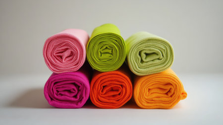 A stylish arrangement of colorful soft bath towels stacked on a gentle mint background, perfect for home decor or bathroom accessories, creating a cozy atmosphere.