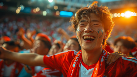 Japan fan with flag painted face cheering at sports event with blurry stadium background