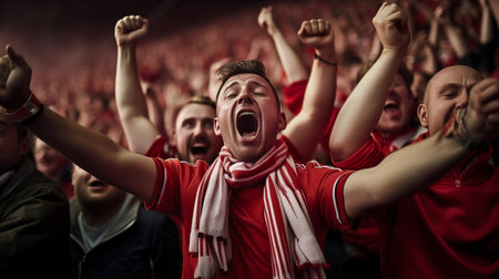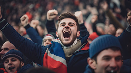 Exuberant football fans cheering with passion at a live stadium game