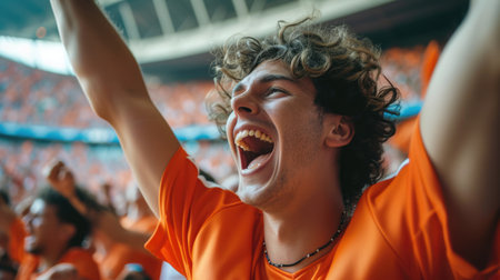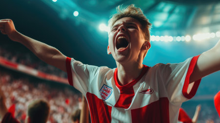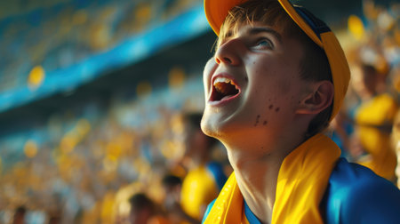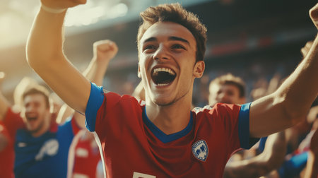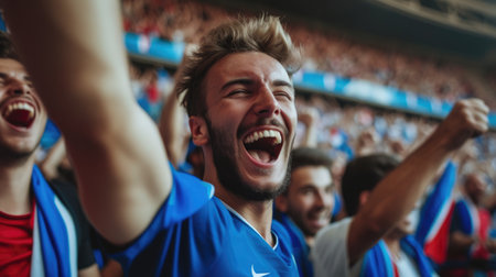 A joyful fan at a football event, joyfully shouting and gesturing, raising his hands in the air, showing his love for the game.