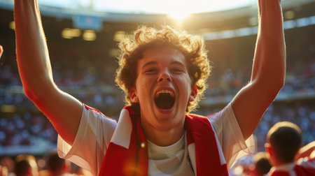 A young fan at a soccer championship raises his arms in excitement, adding to the energetic gestures of the crowd, creating a fun and happy atmosphere at the event. AIG41