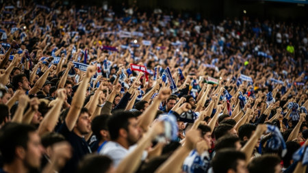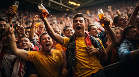 Football fans cheering and supporting their favorite team on the stands of the stadium
