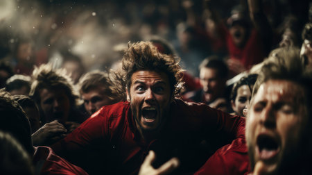 Intense scene of ecstatic rugby fans in red cheering passionately in a crowded night-time stadium setting filled with energetically charged emotions.