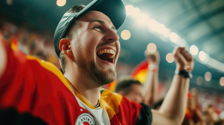 A jubilant soccer fan celebrates a goal, cheering and clapping in a stadium filled with spectators during a crucial match. AIG41