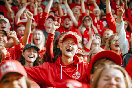 Amidst the electrifying atmosphere of the stadium, a sea of enthusiastic sports fans rises to their feet, their cheers echoing throughout the arena as they rally behind their beloved team, encouraging them towards victory with unwavering support.