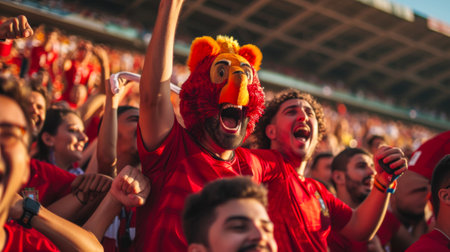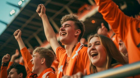 Fan football, Celebrating the success. Supporters cheer in bleacher. Generative Ai