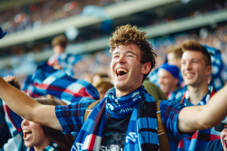 A vibrant scene capturing excited sports fans wearing colorful scarves, showcasing their team spirit and camaraderie in a lively stadium atmosphere.