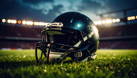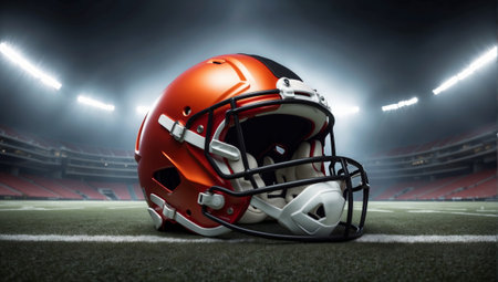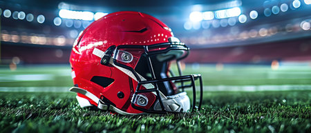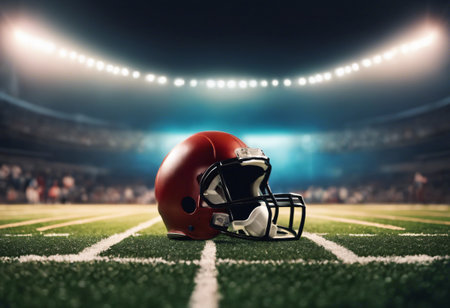 Red football helmet on field, sharp focus, dramatic stadium lights
