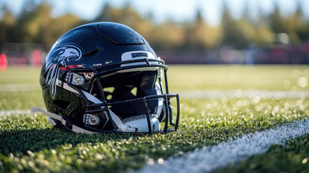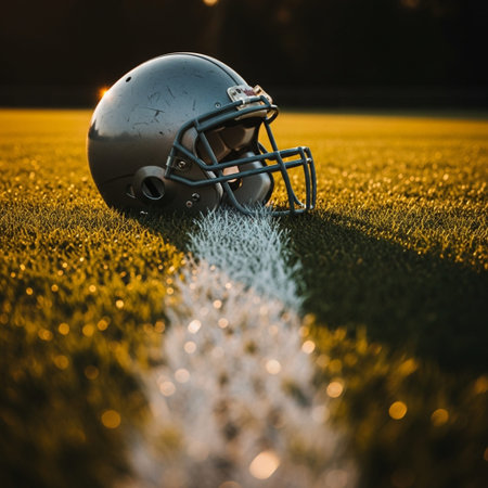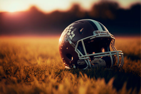 a close-up of an american football helmet laying on a grassy field, created with generative ai