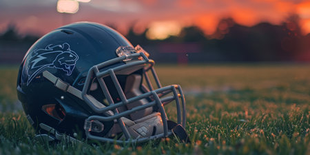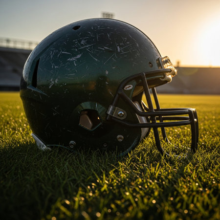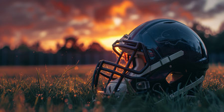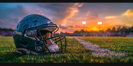 Worn American football helmet resting on green turf at dramatic cinematic dusk, high realism.