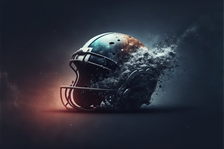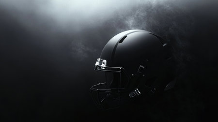 This striking image features a sleek black football helmet set against a dark background, surrounded by wisps of smoke and dramatic lighting, perfect for sports themes.