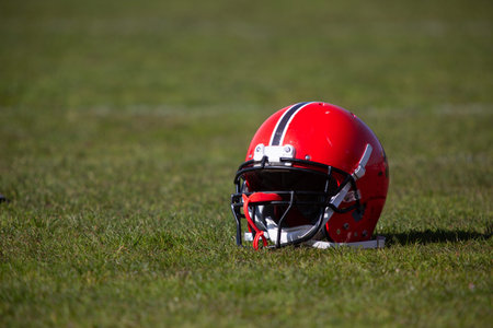 Close-up shot of American football helmet lying on green field of football stadium. Protective helmet with wire mask is an important element of a football player's equipment. Blurred background