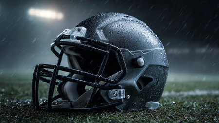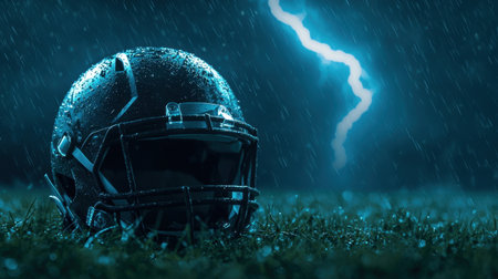 A dramatic football helmet sits on a rain-soaked field under a striking lightning bolt, capturing the raw power of nature and the intensity of the sport.