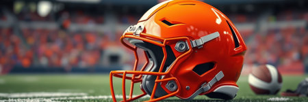 Bright orange football helmet resting on a field with a game ball in a stadium setting