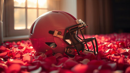 Football helmet and romance. A football helmet placed on a bed of red rose petals by a sunlit window, blending sports and romantic themes in a warm and serene setting.