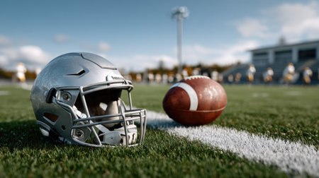 A shiny silver football helmet rests beside a traditional brown leather football on a vibrant green turf field. The setting features a serene blue sky, enhancing the sports atmosphere.