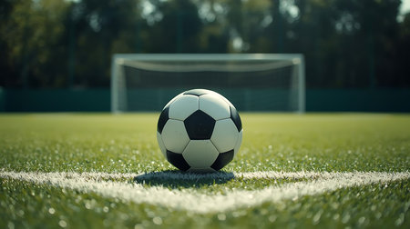 Soccer ball on a grassy field with goalposts in the background. Concept of sports equipment, outdoor activity, football game, athletic training.