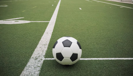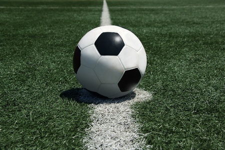Soccer ball rests on the green grass of the field with the white boundary line in the foreground, embodying the spirit of the game