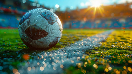 Close-up of a soccer ball on a sunlit stadium field, capturing the essence of sports and competition.