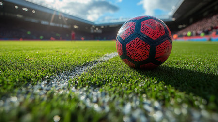A vibrant red soccer ball marked 2025 rests on the lush green grass at a modern stadium during a sunny day in early spring. Generative AI