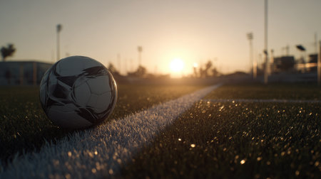 A stunning close-up view of a soccer ball resting on a vibrant field during sunset, capturing the serene moment and inspiring a sense of community and passion for the sport.