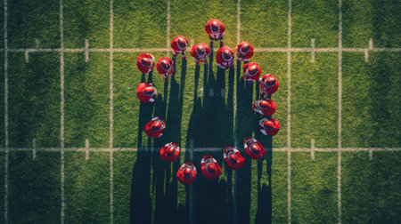 Football teammates huddling on the field under stadium lights at night, celebrating teamwork and unity after a play, showing determination, camaraderie, and competitive spirit
