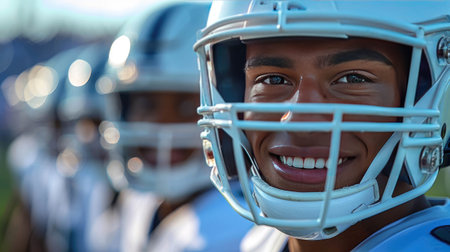 American football team players in uniforms and helmets posing together inside a stadium inflatable tunnel, preparing for a game with determination and confidence