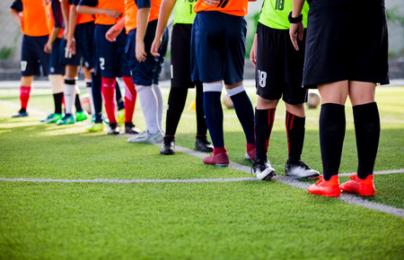 Two Professional Soccer Teams Posing for a Photo and Standing in Line. Professional Football Players Standing Before Important Match.