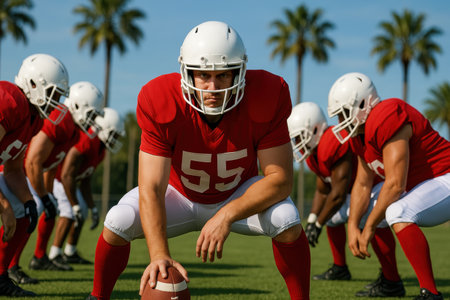 American football players crouched on green artificial turf under stadium lights, lined up for a night scrimmage, focused and ready for intense teamwork and competitive play