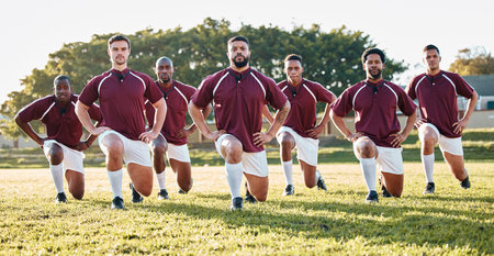 Rugby, sports and a team of men portrait doing lunges for training or competition game on a field. Fitness, sport and stretching with diversity athlete group in a warm up before an outdoor match