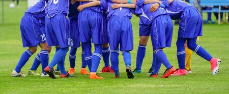 Soccer team with junior coach gathering together in a circle, to strategize and motivate. Football youth team standing together outdooe on grass pitch