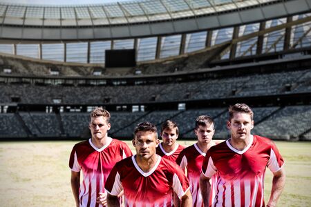 Rear view of active diverse male rugby players standing in a row at stadium for match on a sunny day.